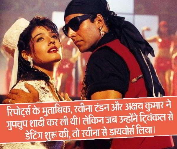 एक समय अक्षय कुमार के इश्क के किस्से काफी मशहूर थे। उनका नाम उस दौर की तकरीबन हर बड़ी एक्ट्रेस के साथ जुड़ा है। कहा जाता है कि उन्होंने रवीना टंडन से गुपचुप शादी तक कर ली थी। हालांकि, जब अक्षय ने ट्विंकल के साथ डेटिंग शुरू कि तो उन्होंने रवीना से तलाक लिया था।