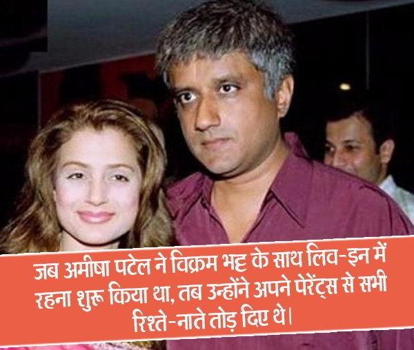 पेरेंट्स के खिलाफ जाकर अमीषा पटेल फिल्ममेकर विक्रम भट्ट के साथ लिव-इन रिलेशनशिप में रहीं। जब वे विक्रम के साथ रिलेशनशिप में थीं, तब उन्होंने पेरेंट्स से पूरी तरह से बात बंद कर दी थी। अमिशा पटेल एक भारतीय बॉलीवुड अभिनेत्री हैं सुंदर अभिनेत्री ने 2 99 2 में सुपरस्टार रितिक रोशन के विपरीत फिल्म 'कहो ना ... प्यार है' में अभिनय की शुरुआत की है। उन्होंने फिल्म "गदर: एक प्रेम कथा" में अपने प्रदर्शन के लिए एक महान प्रशंसा जीती है, जिसने कमाया था उसे फिल्मफेयर "विशेष प्रदर्शन पुरस्कार" उन्होंने 2011 में अपनी खुद की उत्पादन कंपनी अमिशा पटेल प्रोडक्शंस की स्थापना की। वह तेलुगू फिल्मों में भी काम करती है। वह जल्द ही आने वाली फिल्मों में भैयाजी सुपरहिट और रन भोला रन में देखी जाएगी।