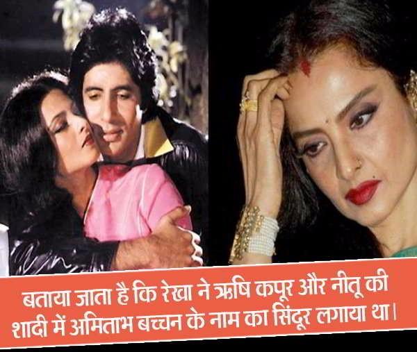 22 जनवरी, 1980 को ऋषि कपूर और नीतू की शादी हुई थी। नीतू ने अपनी करीबी दोस्त रेखा को भी बुलाया था। पार्टी में अमिताभ बच्चन, जया बच्चन, तेजी बच्चन समेत कई सेलेब्स पहुंचे थे। इस बीच सफेद रंग की साड़ी व मंगलसूत्र पहने और माथे पर लाल रंग की बिंदी लगाए हुए रेखा पहुंचीं। मांग में भरा सिंदूर सबका ध्यान अपनी ओर खींच रहा था। कहा जाता है कि रेखा ने उस दिन अमिताभ ने नाम का सिंदूर लगाया था।
