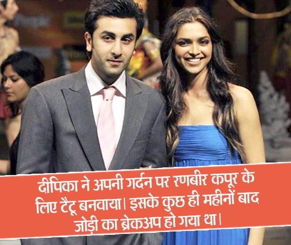 2008 में आई फिल्म 'बचना-ए-हसीनों' के सेट पर दीपिका और रणबीर कपूर का इश्क परवान चढ़ा। रणबीर के प्यार में खोई दीपिका ने उस वक्त अपनी गर्दन पर 'RK' का टैटू गुदवा लिया था। हालांकि, इसके कुछ ही महीनों बाद जोड़ी का ब्रेकअप हो गया था.